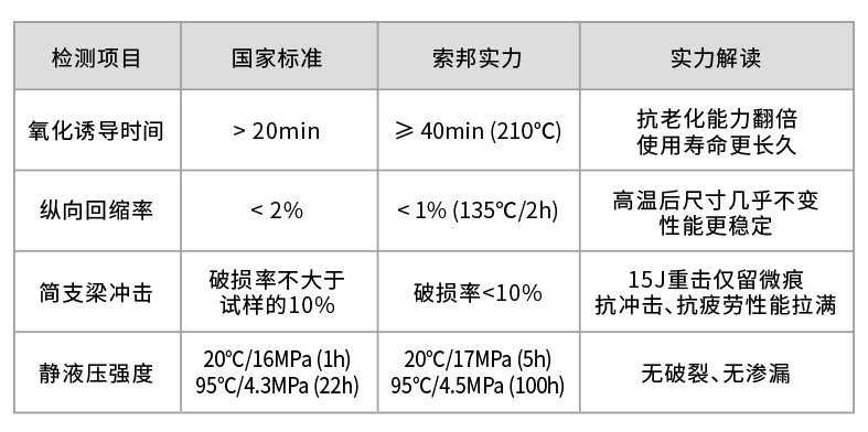 成品出厂前,索邦管要经历多道“极限挑战”,各项性能均大幅超越国家标准GB/T 18742.2-2017: